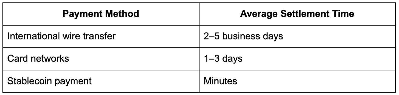 Stablecoin transactions settle in only a few minutes, while regular wires can take two to five days.