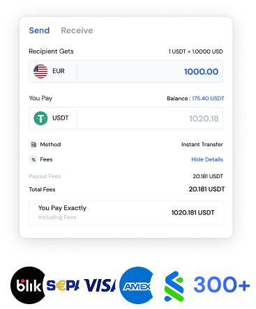 TransFi cung cấp một công cụ chuyển đổi tích hợp cho phép bạn chuyển đổi ngay lập tức các khoản thanh toán tiền điện tử thành loại tiền pháp định ưa thích của bạn. Tiền được chuyển vào tài khoản ngân hàng của bạn bằng nội tệ với tỷ giá hối đoái được khóa, mang lại cho bạn khả năng dự đoán mà không phải chịu sự biến động của tiền điện tử.